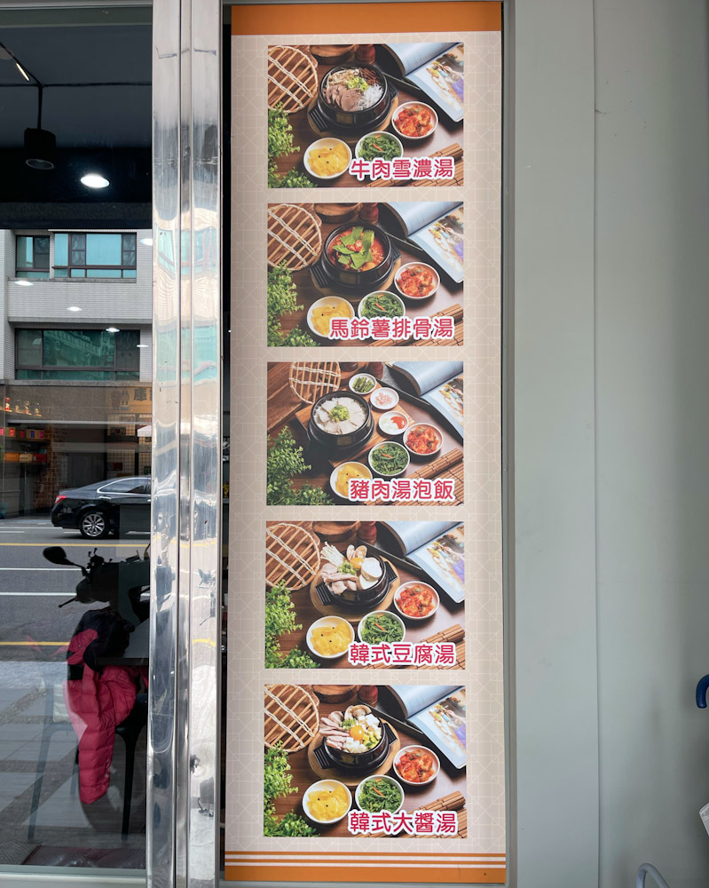 ▲店外就有韓式鍋物照片可供點餐時的參考,鍋物均附白飯,還有韓式小菜和飲料無限續 !