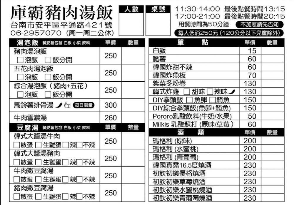 庫霸豬肉湯飯低消250元(120公分以下兒童除外),若客滿內用時間50分鐘。(不收服務費)