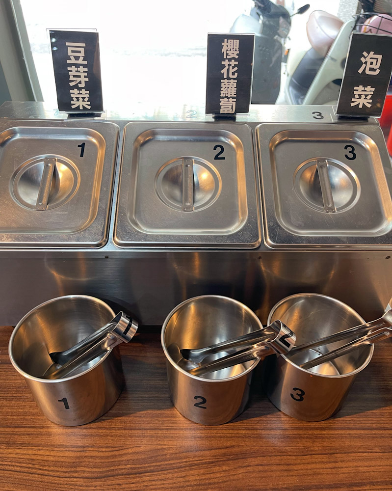 ▲小菜有豆芽菜、櫻花蘿蔔、泡菜,都有附蓋子和專屬夾不混味,乾淨又衛生。