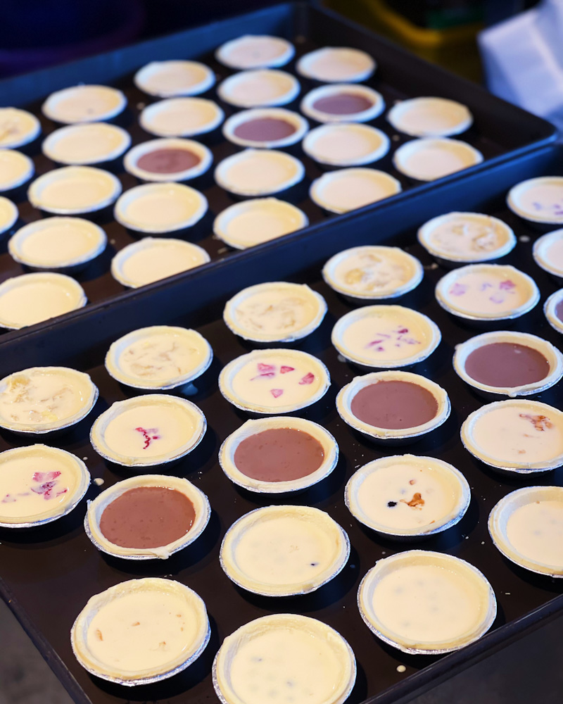 ▲準備送入烤箱的蛋塔排列的整整齊齊,這裡不只賣原味蛋塔,還有珍珠、焦糖、蜂蜜檸檬、巧克力、酒香葡萄、香蕉巧克力,總共7種口味。