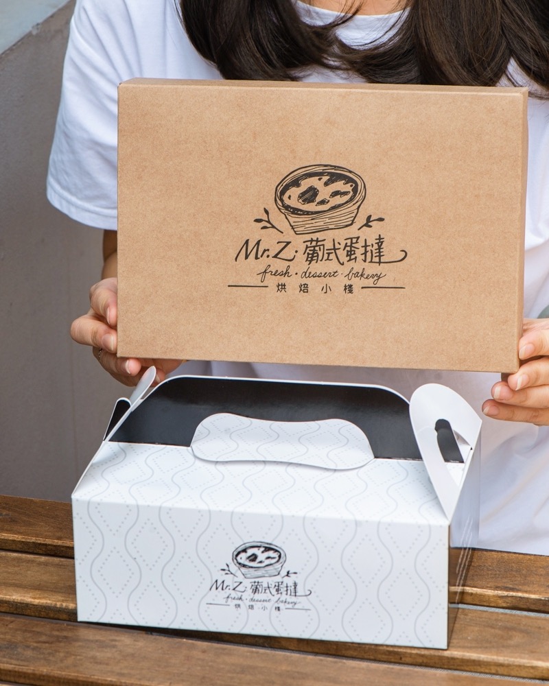 ▲二話不說 ! 馬上買了一盒蛋塔與一盒布丁,蛋塔是牛皮紙盒外包裝,布丁是白色手提式禮盒包裝,簡約的設計中又帶點小文青呢 !