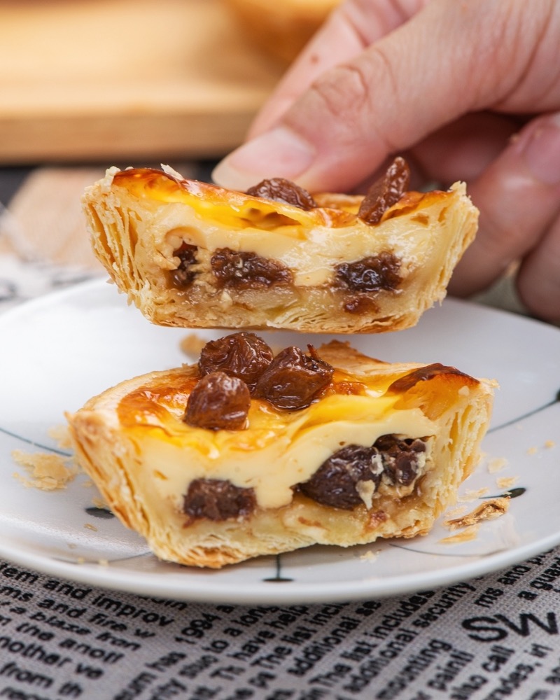 ▲切開酒香葡萄蛋塔裡面還有酒釀葡萄內餡,咬到葡萄時爆汁香甜,搭配滑嫩的蛋塔一起吃,美味更上好幾層 !